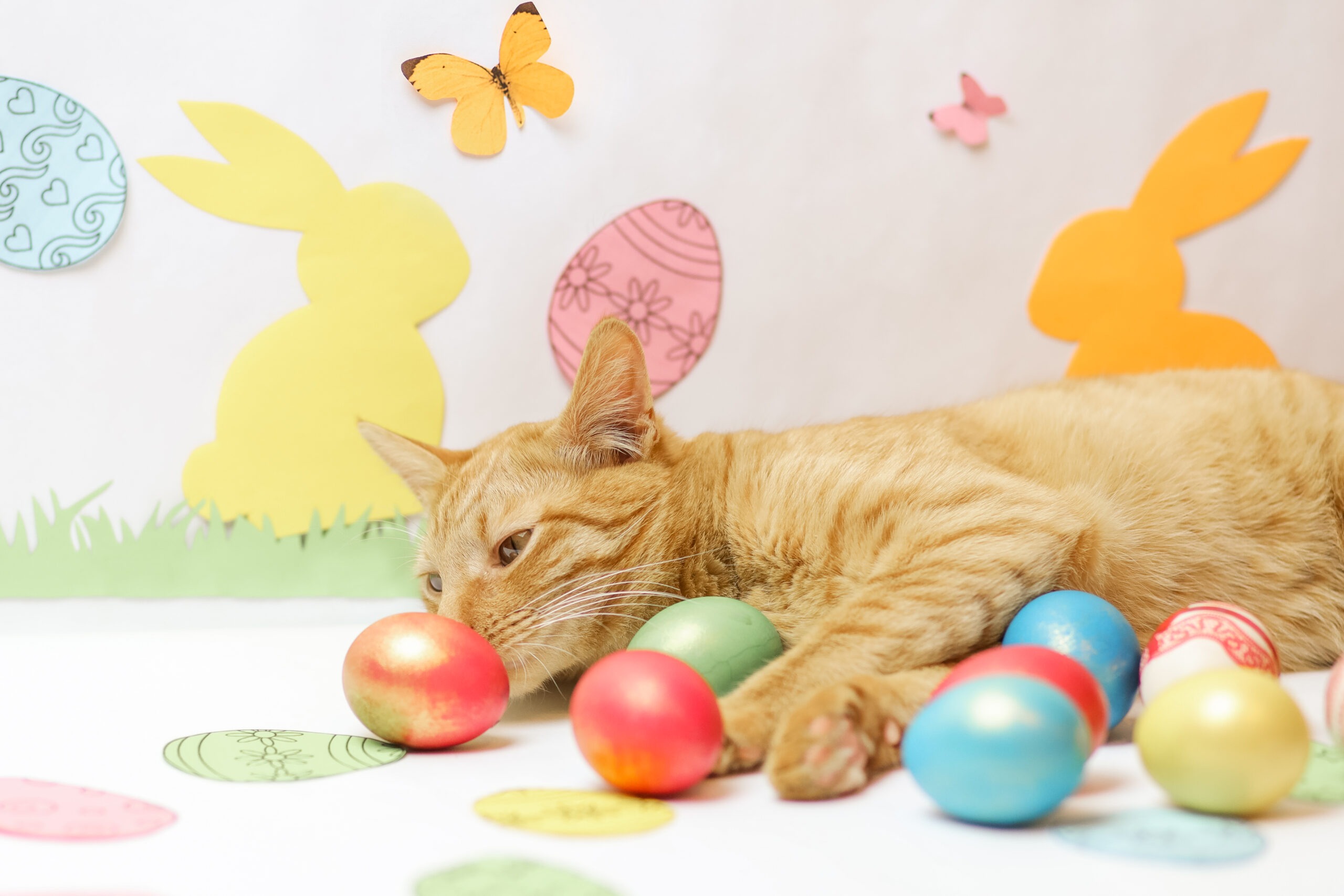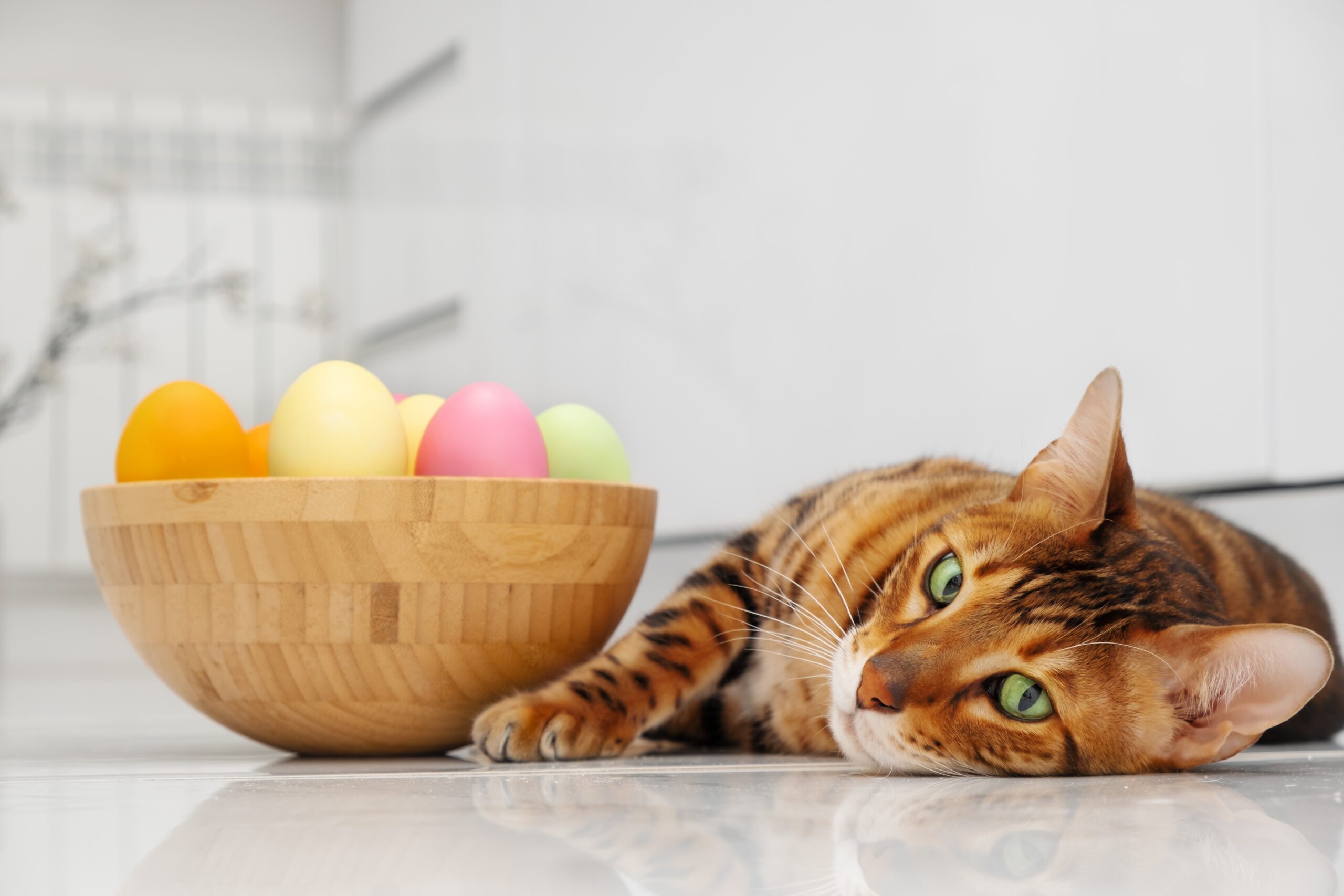 Bitte achte darauf, dass dein Stubentiger nicht an österliche Naschereien gelangt. Auch kleine Deko-Ostereier aus Plastik oder Metall können verschluckt werden – mit gefährlichen Folgen. Sicher ist sicher: Süßes und Glänzendes außer Reichweite lagern.