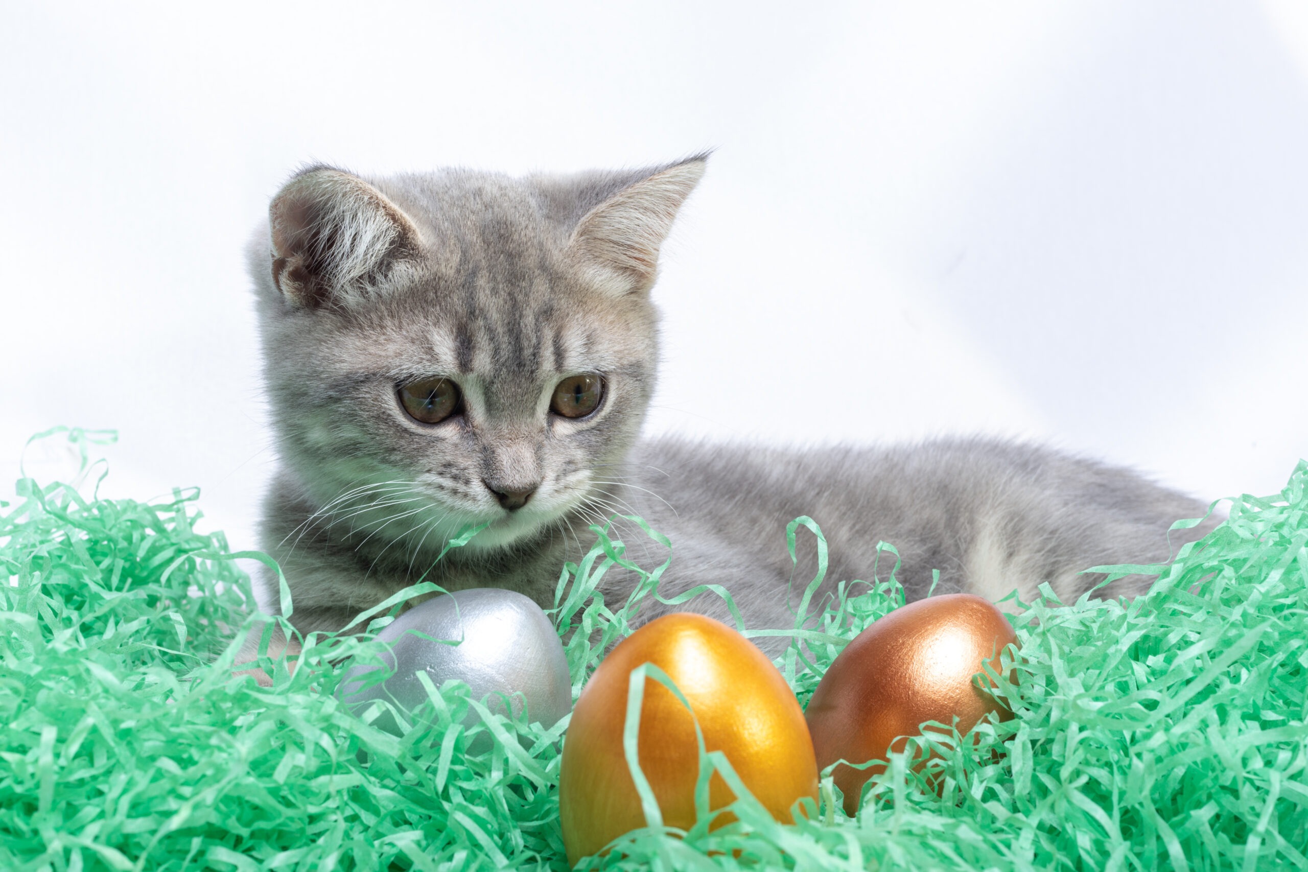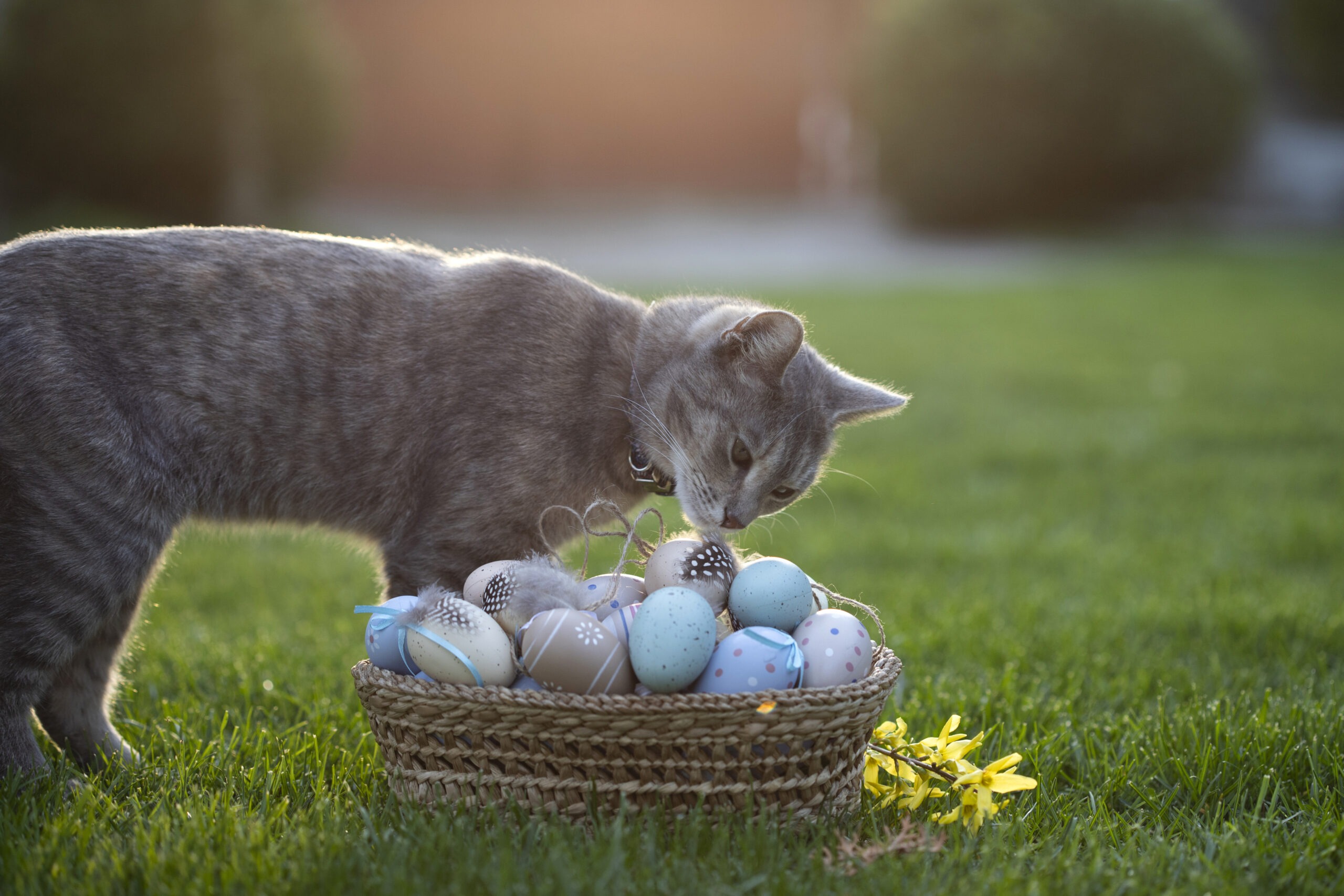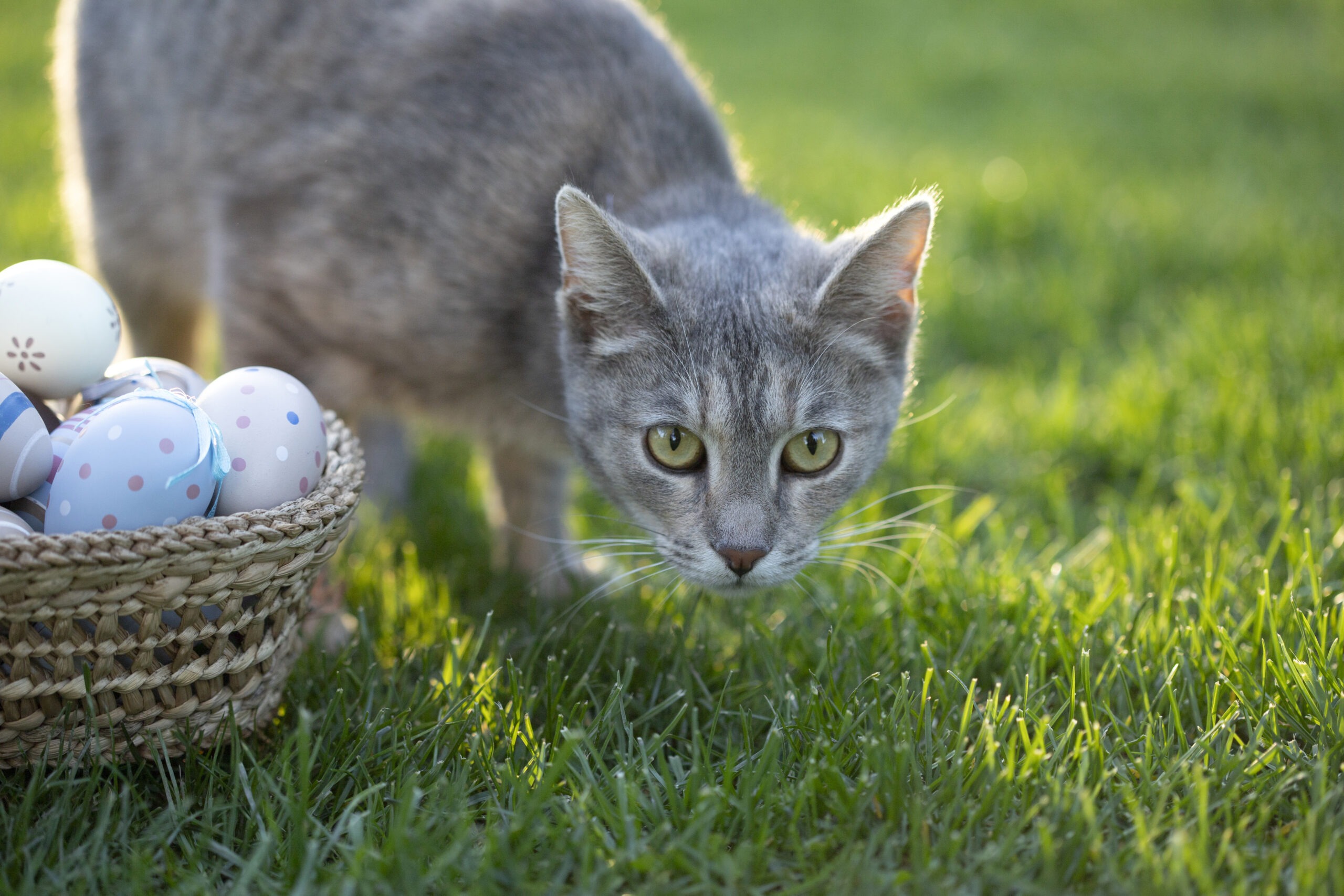 Egal ob Papier, Plastik oder Natur – Ostergras ist für Katzen wie ein Magnet. Leider kann es beim Verschlucken zu gefährlichen Verdauungsproblemen führen. Auch Schleifen, Federn oder Glitzerkugeln bergen Risiken, vor allem bei verspielt-kreativen Katzen.